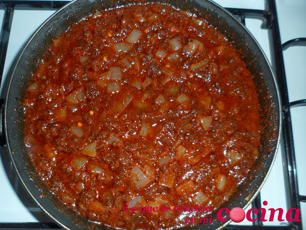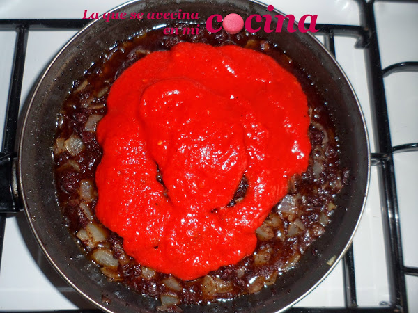 Añadimos la salsa de pimientos del piquillo.