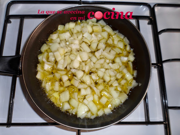 En primer lugar picaremos la cebolla en trocitos pequeñitos para que cuando cerremos las empanadillas no sobresalgan demasiado. Una vez picadas, la pondremos a pochar en una sartén con aceite.