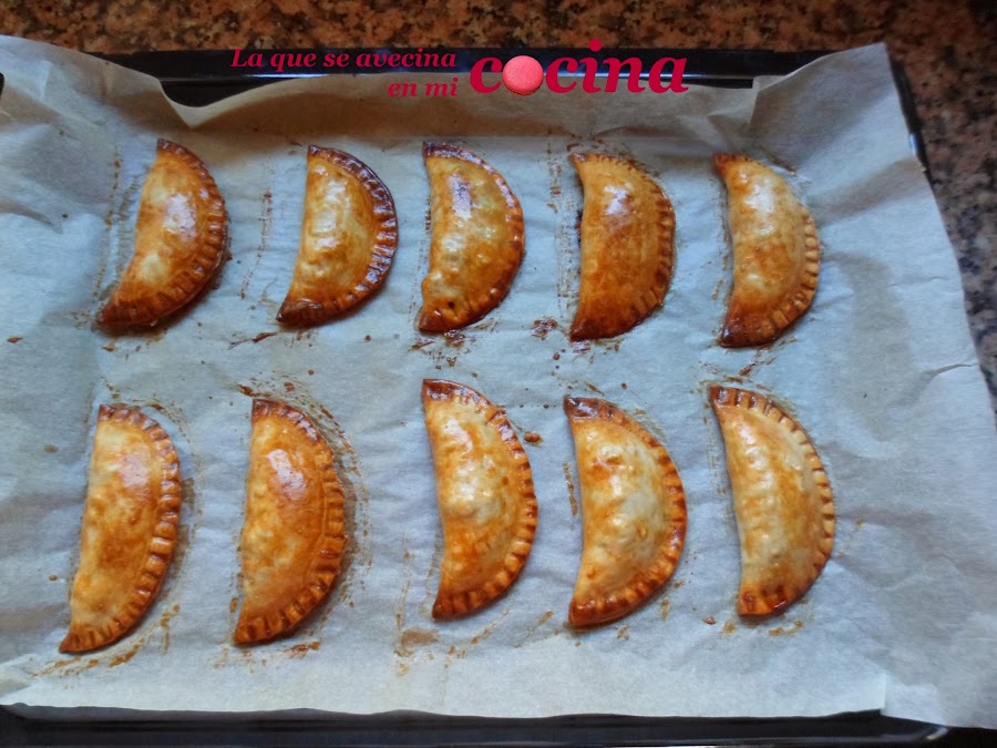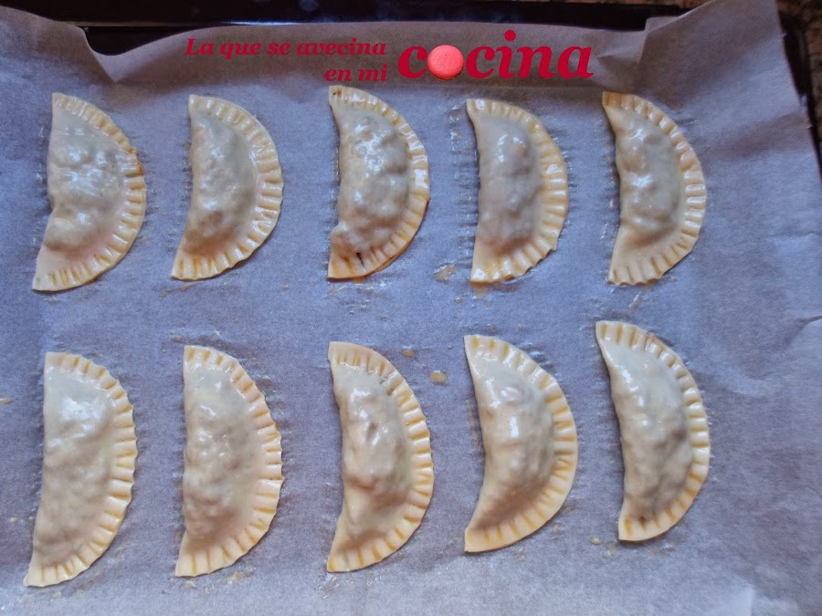 Una vez que tengamos todas nuestras empanadillas cerradas, las pondremos en una bandeja de horno y las pincelaremos con huevo batido. Esto es para que queden más doraditas.