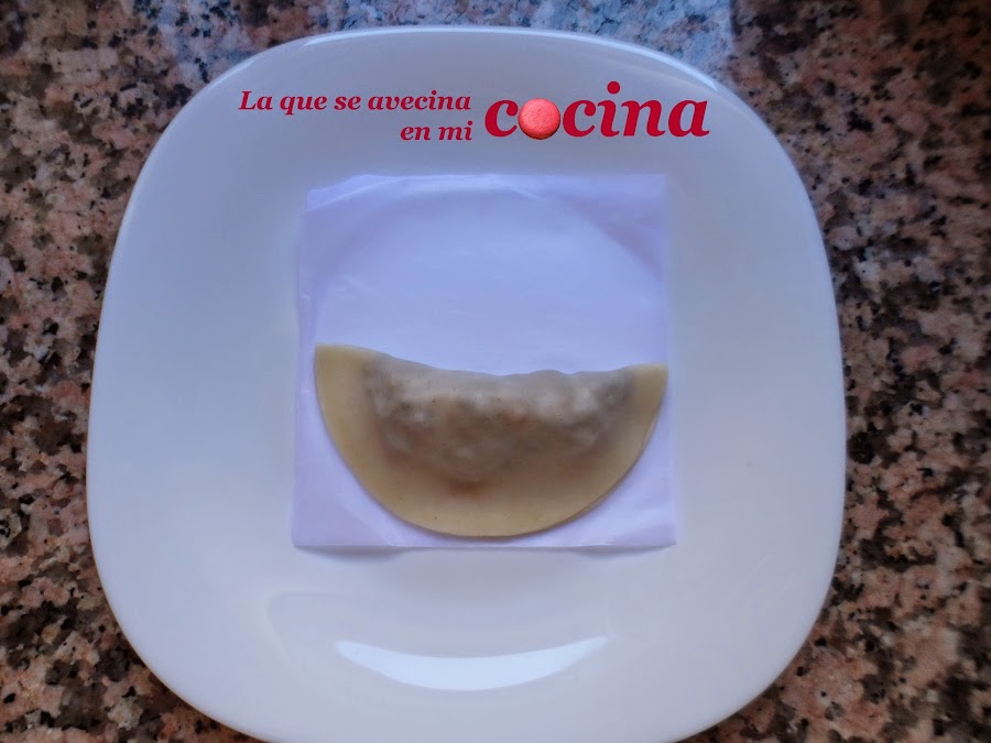 Ahora ya sólo nos faltaría formar las empanadillas. Para ello cogeremos la oblea y le pondremos el relleno aproximadamente en la mitad de la misma. Luego solapamos la empanadilla cuidadosamente y nos ayudamos de los dedos para dejarla bien encajada. Con un tenedor iremos sellando el filo para que no se salga nada.