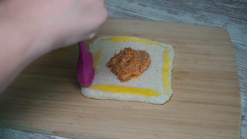 Ahora, vamos a pasar un rodillo de cocina por cada rebanada de pan de molde para dejarla bien planita o aplastada. Le colocamos en medio una cucharadita del relleno que hemos preparado.