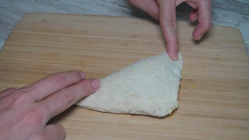 Con la ayuda de la mano o un tenedor, vamos a ir cerrando las rebanadas, desde una esquina hacia otra esquina del pan, haciendo una empanadilla.