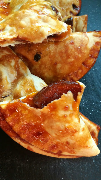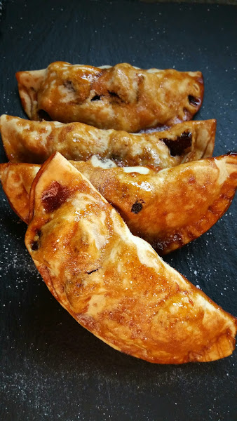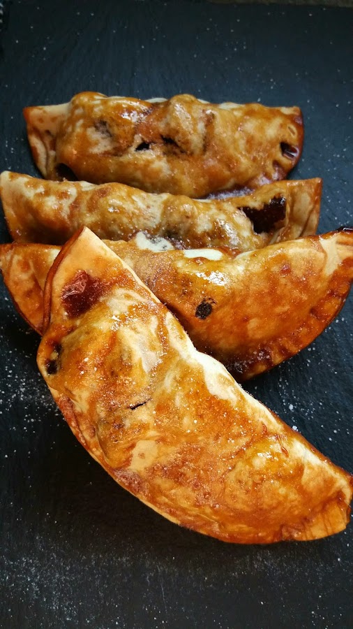 Tengo un montón de peras que nos han regalado. Ya hice mermelada, pero le eché panela en vez de azúcar, y, aunque está muy buena, no es muy fotogénica, por el color oscuro que le da la panela. Y como me siguen sobrando, y tenía un paquete de obleas de empanadillas perdido por la nevera, pues nada, que mejor que hacer para la merienda, estas empanadillas dulces.