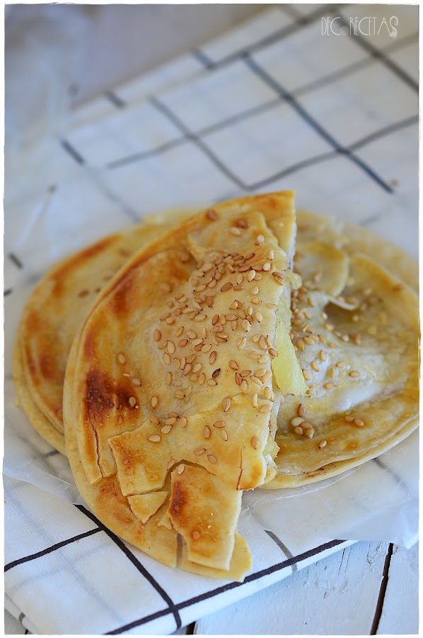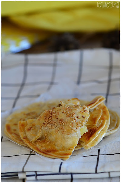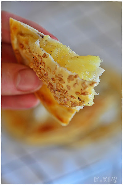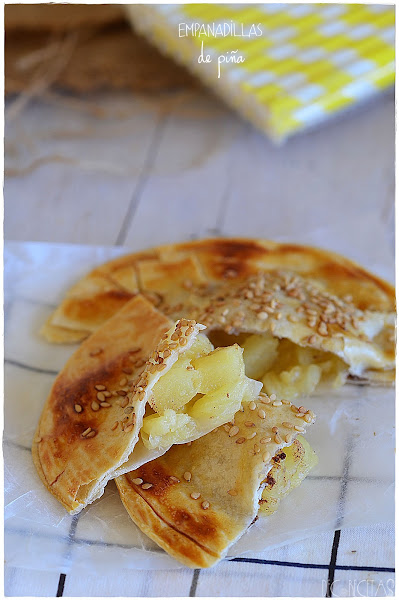 Para realizar la receta dispondremos trocitos de piña cortados encima de una masa de empanadillas y espolvoreamos canela al gusto. Cerramos con otro disco de masa de empanadilla pintando la superficie con huevo y espolvoreando sésamo por encima. las llevamos al horno precalentado a 180° por unos 10 minutos con cuidado de que no se nos queme