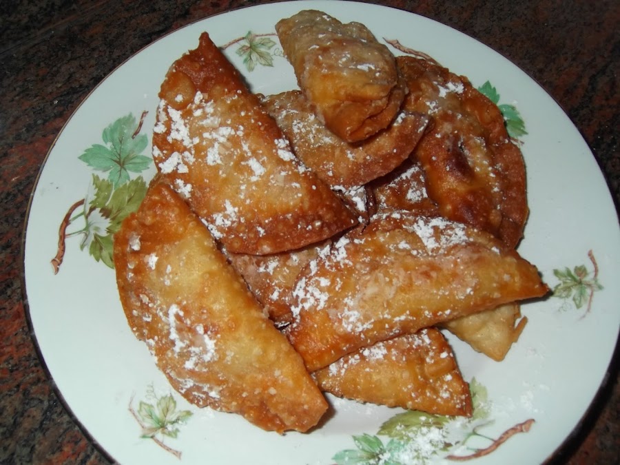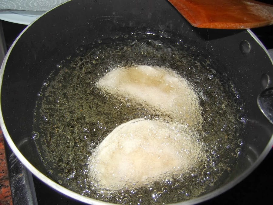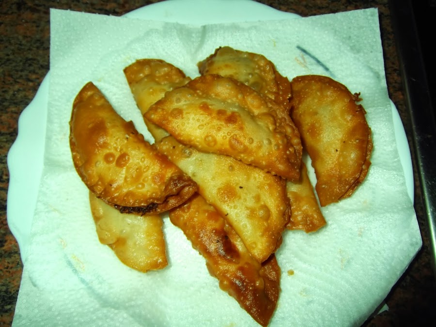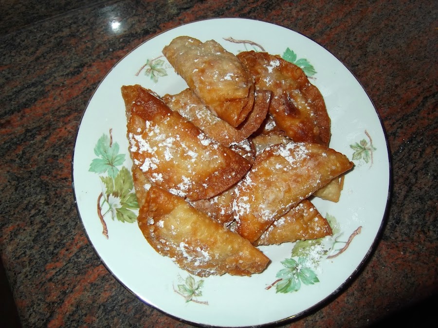 Luego cerráis las empanadillas y ponéis el aceite de girasol calentar, Cuando esté lo suficientemente caliente, echáis las empanadillas y las freís un poco por cada lado hasta que veáis que están doradas. Las escurrís en papel absorbente y las echáis en un plato que tendréis con azúcar glass y canela. Y ya están listas para comer. Un rico postre que cuesta muy poco hacerlo, pero que está muy bueno.