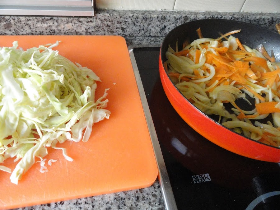 pelador, vamos dorando y agregamos el repollo también cortado en juliana fina, ponemos sal, dejamos pochar tapado, a fuego medio, y cuando esté hecho agregamos la salsa de soja, dejamos evaporar, apartamos y dejamos templar. Agregamos unas nueces en trocitos para que aporte un toque crujiente, muy rico, junto con el crujiente de la oblea claro.