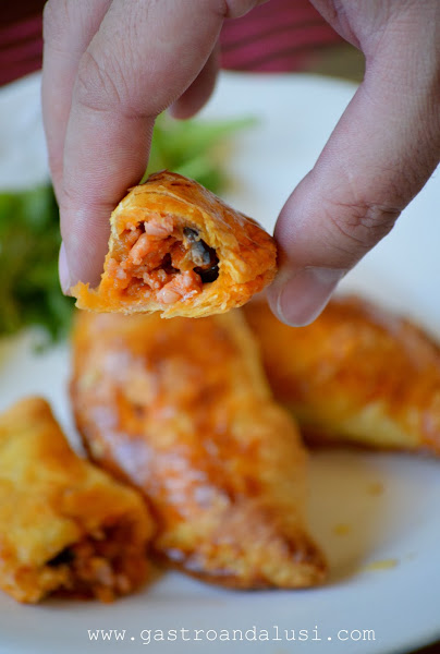 Dejamos enfriar el relleno. Mientras podemos cortar la plancha de hojaldre en círculos para hacer las empanadillas. Ya solo nos queda ponerles el relleno en medio, cerrarlas, sellarlas y pincelar un huevo batido para que les de brillo. Las metemos en el horno entre 10-15 minutos hasta que el hojaldre esté listo.