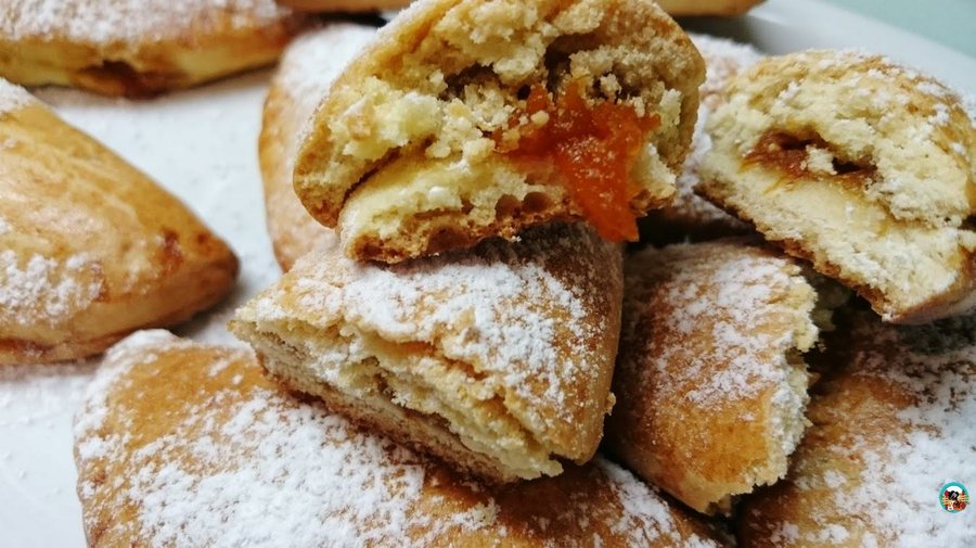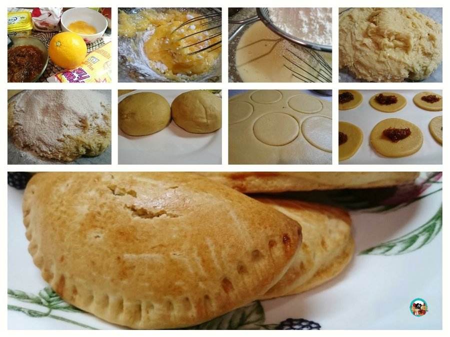 3.- Espolvoreamos con harina una mesa de trabajo, o cubrimos con papel sulfurizado (papel para hornear). Extendemos la masa con un rodillo hasta que quede bien fina. Cortamos círculos con un aro de cocina o una taza para el desayuno. Colocamos en el centro de cada círculo una cuchara de café de mermelada de calabaza. Cerramos los círculos de la masa por la mitad, sellamos cada empanadilla con un tenedor, lo hacemos bien por ambos lados. Para que no se habrán cuando estén en el horno. Pincelamos con el huevo, Cocinamos en el horno a 180ºC, 15 0 20 minutos, hasta que estén dorados. Dejamos enfriar sobre una rejilla y espolvoreamos con azúcar glas.