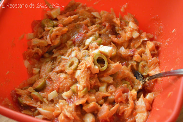 Desmigamos el bonito, cortamos el pimiento asado en tiras y lo colocamos en un bol.
