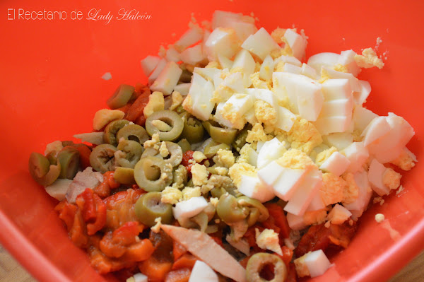 Si tenemos las aceitunas enteras, las troceamos y las añadimos al bol.
