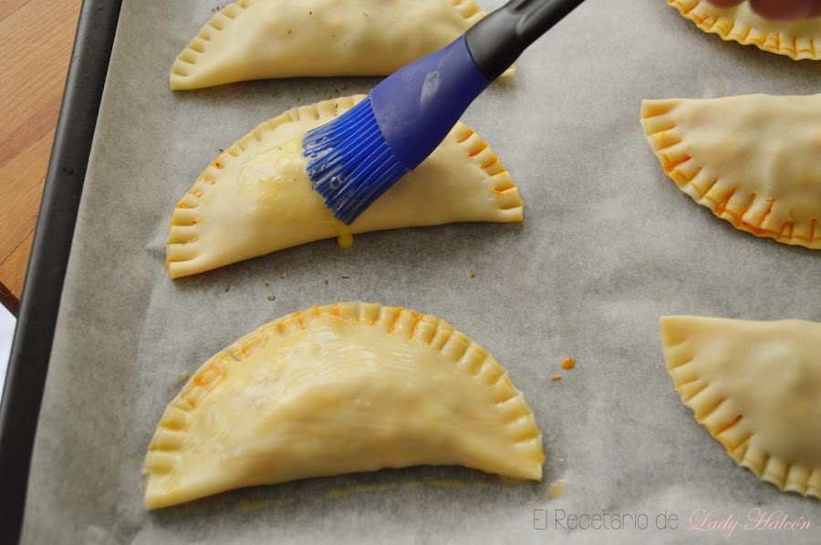 Colocamos las empanadillas sobre una bandeja para el horno forrada con papel para cocinar y las pintamos con un huevo batido. Si has hecho empanadillas de dos tipos, no te olvides de marcarlas con una señal o alguna especie aromática como orégano (o la que más te guste) para distinguirlas luego.