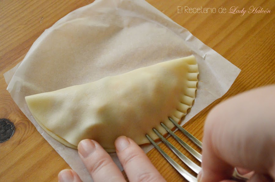 Doblamos la masa haciendo coincidir los bordes para cubrir el relleno y cerramos la masa con la ayuda de un tenedor, hundiéndolo de forma firme pero sin traspasar la masa.