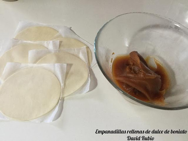 Ponemos en cada oblea una cucharadita de dulce de boniato justo en el centro. No conviene pasarse de cantidad o costara cerrarla sin que se salga.