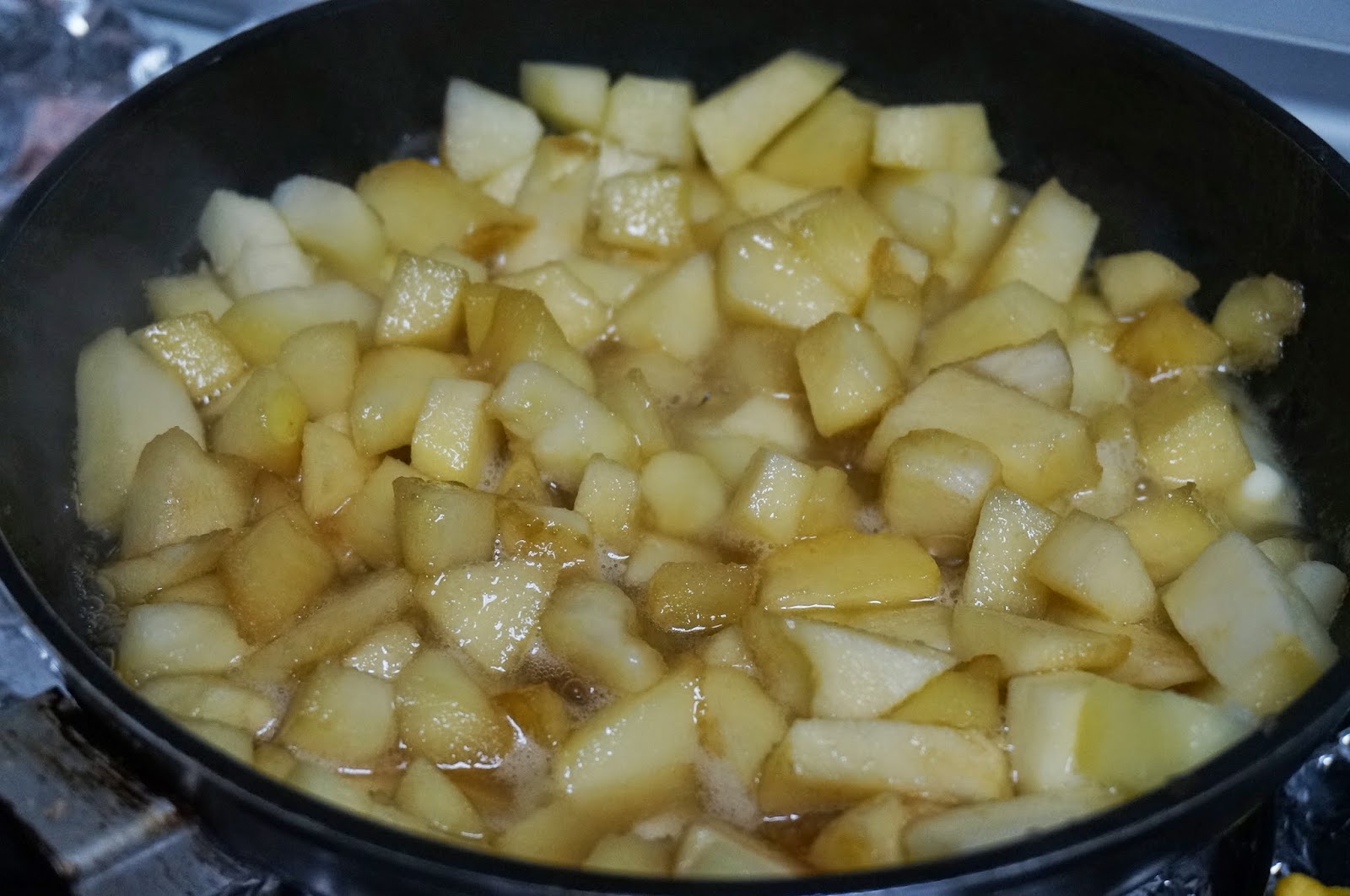 Echaremos la manzana en una sartén y pondremos la mantequilla y el azúcar moreno.