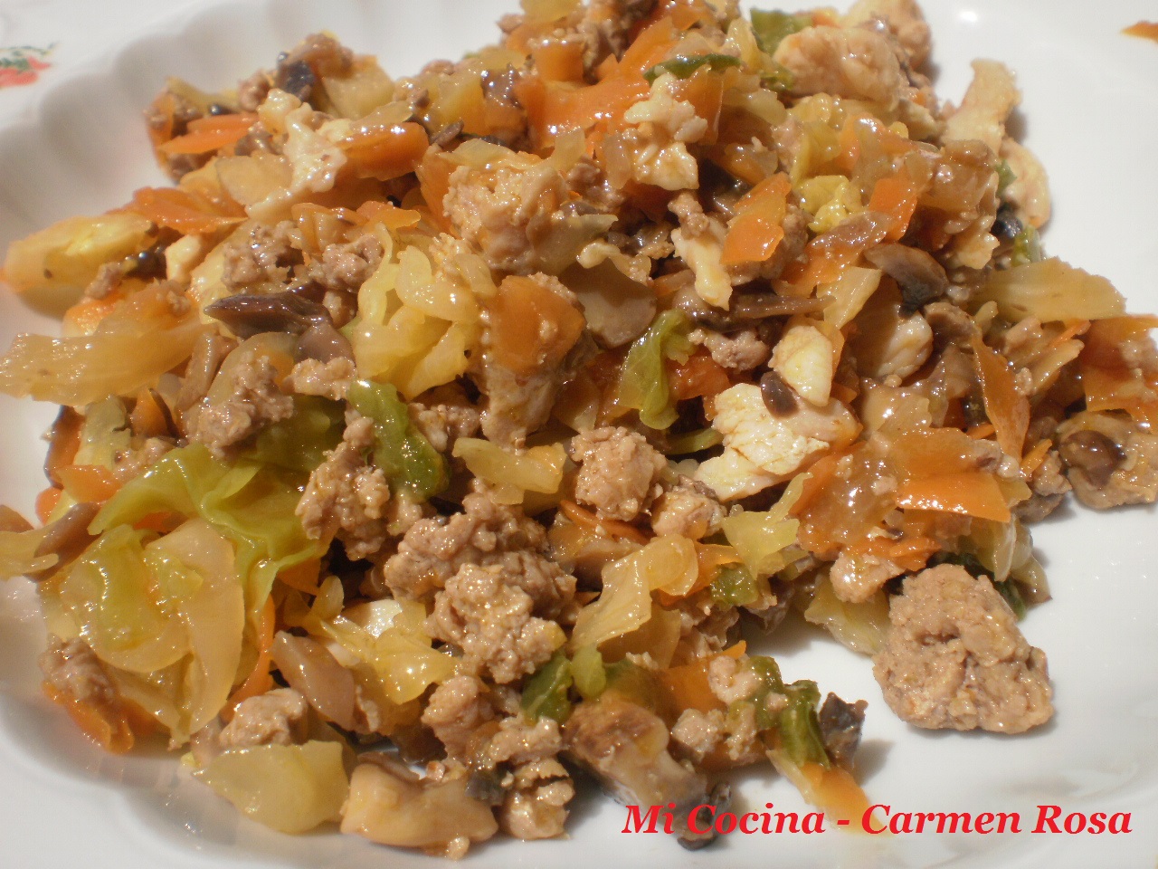 En una sartén echar un chorreoncito de aceite y a fuego medio, ir pochando por éste orden: la zanahoria, pimiento, puerro, cebolla, los champiñones y por último la col, agregándoles un poco de sal para que suden (no demasiada teniendo en cuenta que la soja le da sabor salado) . Entre cada verdura, dejar un tiempo para que se hagan; cuando estén hechas las verduras (no demasiado) agregar tres cucharadas soperas de salsa de soja, espolvorear con jengibre en polvo y echar el refrito de la carne.