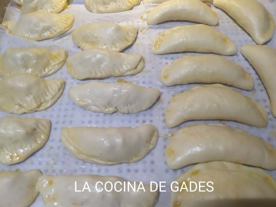 Con un cortapasta redondo cortamos la masa. Rellenamos si llegar a los bordes, los bordes pintamos con huevo batido, cerramos la empanadilla, se nos quedará en forma de media luna, los bordes los cerramos con un tenedor y pintamos la empanadilla con el huevo. Metemos al horno precalentado 200° hasta que se dore las empanadillas.