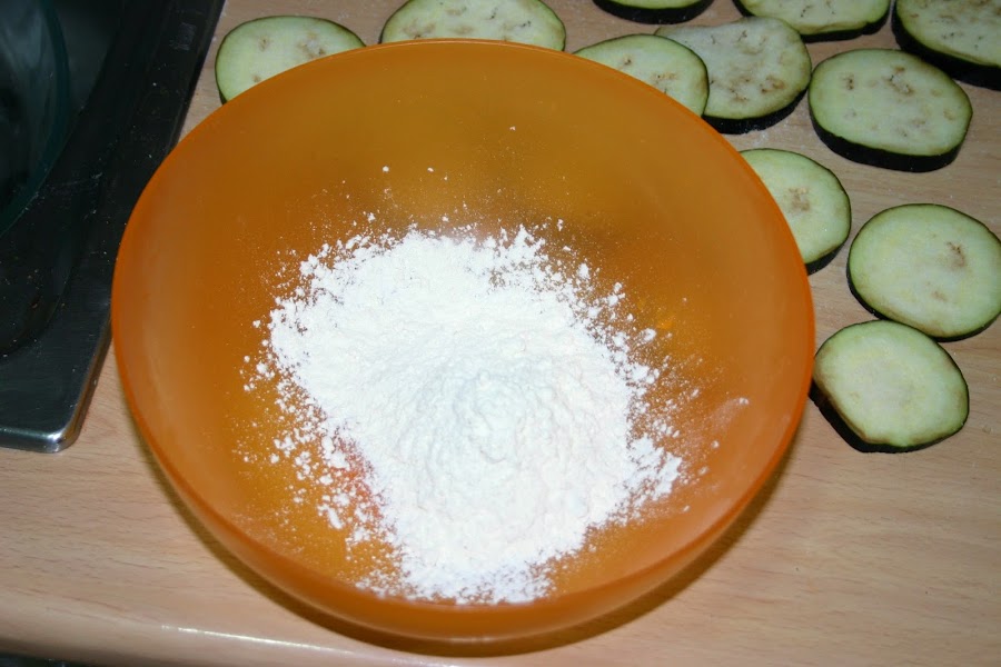 una vez que hemos partido en circulos el calabacin y lo hemos salado, en un bol, echamos harina