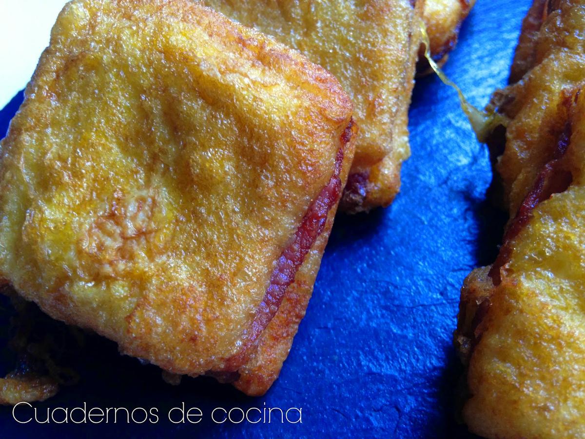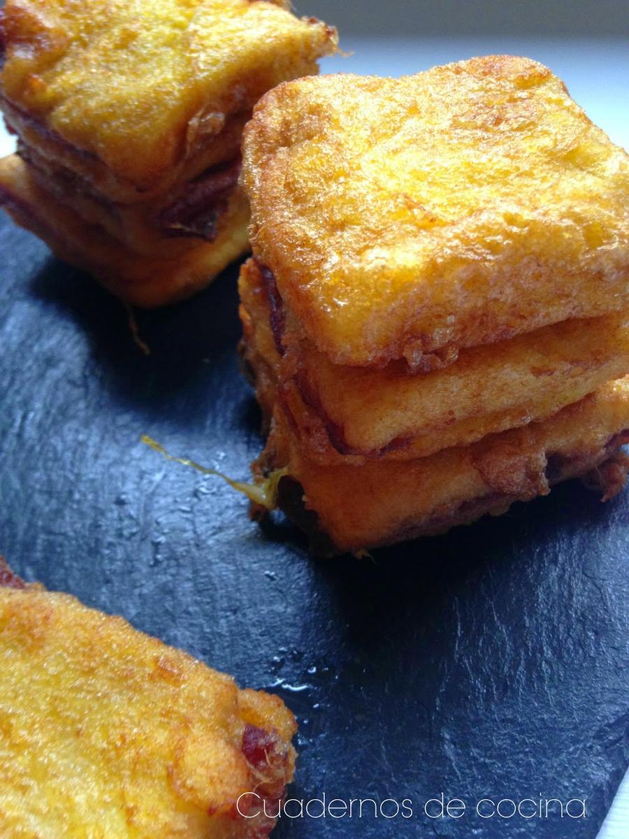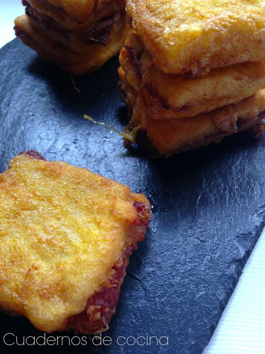 Cortar cada rebanada en dos o cuatro trozos y pasar por huevo batido. Freir en abundante aceite caliente y colocar sobre papel absorbente para que suelten el exceso de aceite.