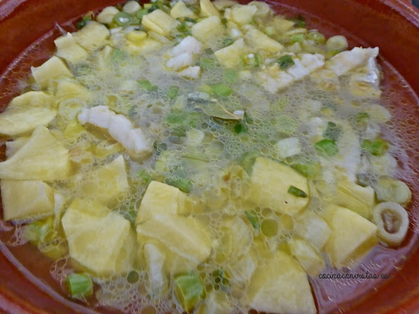 Ponemos a calentar el aceite en una cazuela (mejor si es de barro) y echamos el puerro que se vaya pochando lentamente, cuando empieza a volverse transparente añadimos el bacalao, le damos un par de vueltas y dejamos un par de minutos, ahora echamos el arroz, lo removemos y añadimos las patatas.