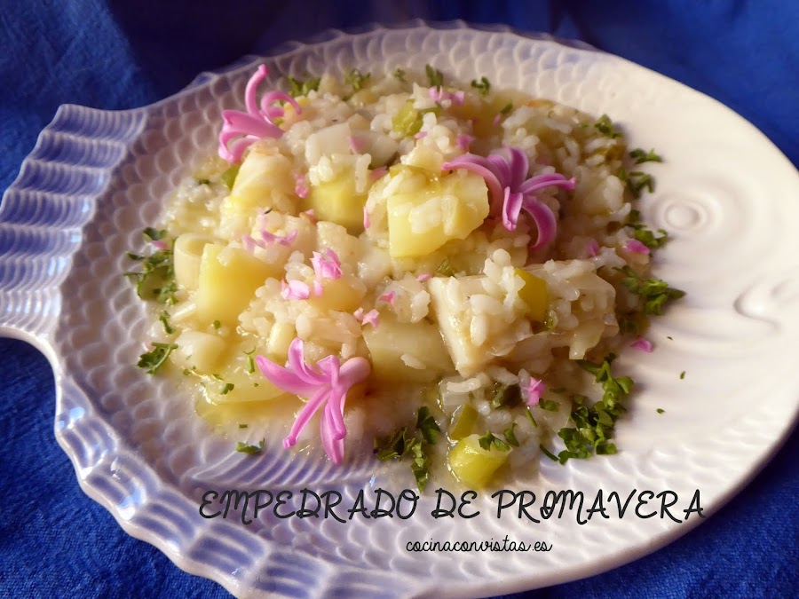 Removemos todo, que se mezclen los ingredientes y agregamos el caldo de pescado (o en su defecto agua). Dejamos que todo se cocine a fuego suave unos 20 minutos. Apagamos el fuego y dejamos que repose unos 5 minutos en la cazuela antes de servirlo. En el momento de servir espolvoreamos con perejil y unas flores de Jacinto picadas y decoramos el plato con flores enteras de Jacinto.