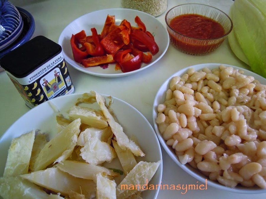 El empedrao , además del bacalao lleva también alubias blancas, puedes ponerlas secas o ya cocidas, yo he optado por las cocidas porque siempre tengo algún bote en la despensa y me es más cómodo.