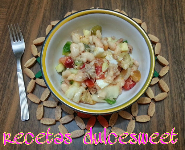 Cambie el bacalao por atún e introduje algunos ingredientes mas. Se pueden utilizar judías cocidas o cocerlas tu mismo, según el tiempo que tengáis para hacer el plato, yo utilizo judías cocidas la verdad, y quedan buenisimas igual.