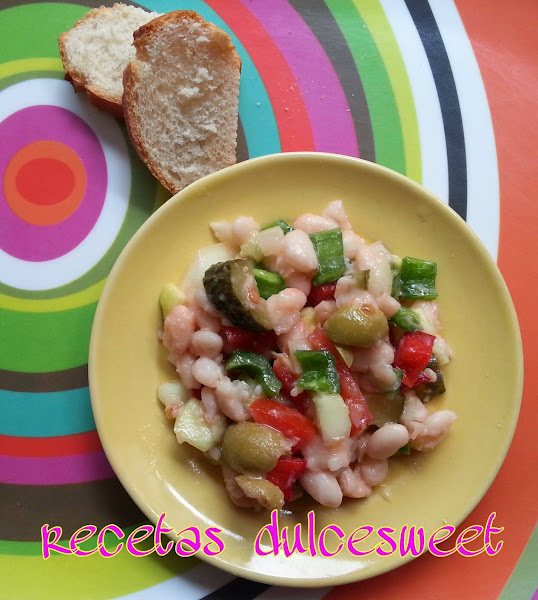 Es una buena manera de comer legumbres en verano, y no dejarlas olvidadas hasta invierno, podéis utilizar garbanzos o lentejas en vez de judías.