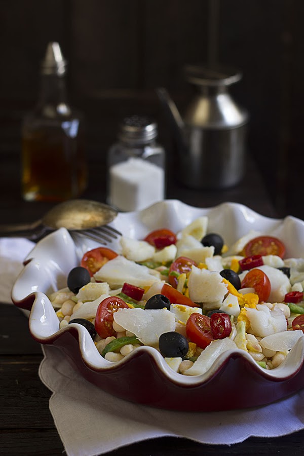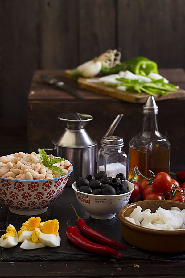 Como es verano y no apetece estar mucho tiempo en la cocina, he utilizado judías blancas cocidas envasadas y he optado por un lomo de bacalao congelado desalado, perfecto para presentarlo en lascas, tampoco he podido resistirme a darle una nota un poco picante y he añadido una punta de guindilla fresca roja, que al bacalao le va que ni pintado.