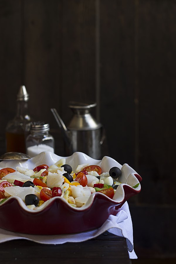 En un bol ponemos las judías, la cebolleta, el pimiento verde, los tomates cherrys reservando alguno para decorar y aliñamos a nuestro gusto con la sal, el vinagre y aceite de oliva virgen. Volcamos sobre una fuente y presentamos poniendo por encima el bacalao en lascas, los tomates cherrys reservados, el huevo picado y unas aceitunas negras. Por último agregamos un poco mas de aceite de oliva virgen por encima.