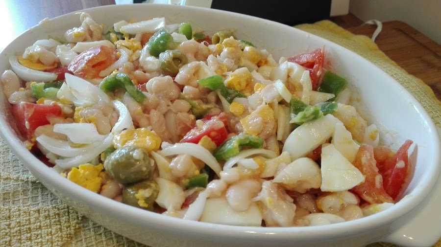 - Añadir la cebolla escurrida y enjuagada con agua, y aliñar con aceite de oliva virgen extra y sal. Yo no le pongo vinagre.