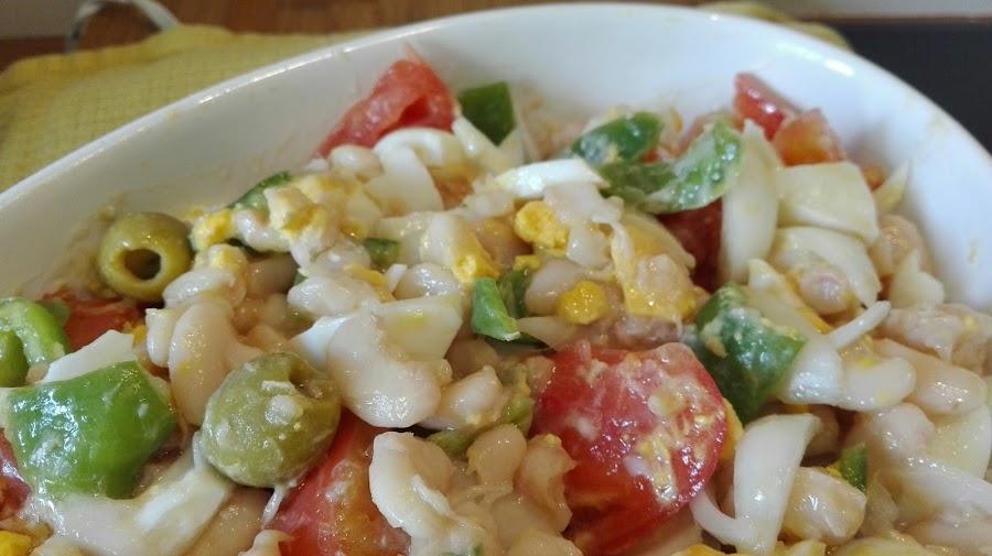 - Picar a trozos no muy pequeños el pimiento, el tomate y los huevos duros, y mezclar en un bol con el resto de ingredientes.