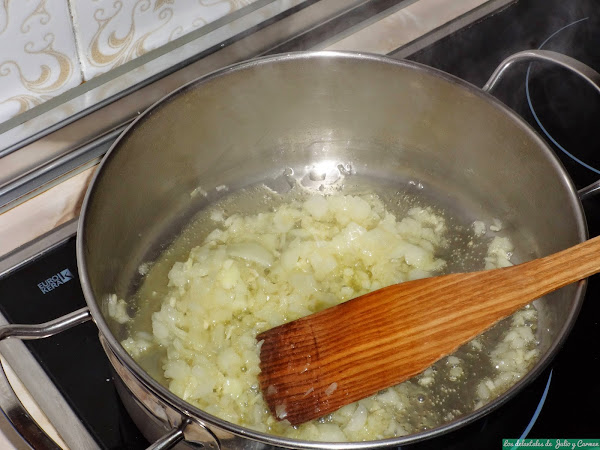 Pelamos y picamos muy finamente el ajo y la media cebolla. Ponemos ambos ingredientes a pochar en una sarten a fuego medio-bajo.