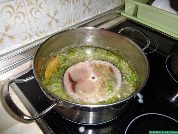 Cuando rompa a hervir, echamos los guisantes congelados (no es necesario descongelarlos), la hoja de laurel y salpimentamos un poco. Lo iremos probando para rectificar de sal en caso de necesitarlo. Dejamos que hierva durante unos 15 minutos. En este punto, si vemos que necesitamos mas caldo, podemos añadir agua y 1/2 pastilla de concentrado de pescado a la salsa.