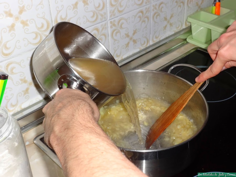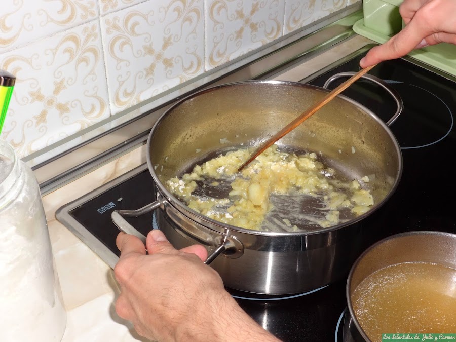 Cuando veamos que la cebolla y el ajo están doraditos, echaremos la cucharada de harina y removeremos para que se tueste un poco.