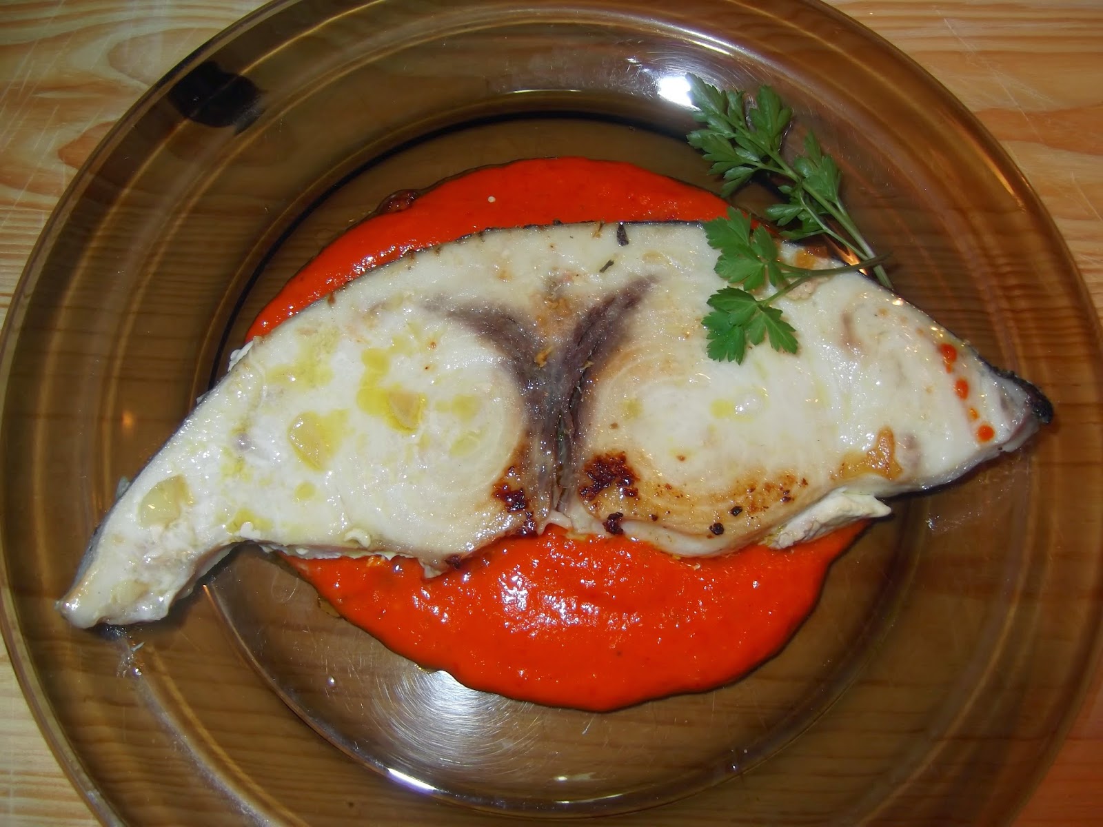 Para montar el plato se coloca la salsa en la base y el filete de emperador encima, si queréis podéis espolvorearlo con un poco de perejil y ya está listo para comer.