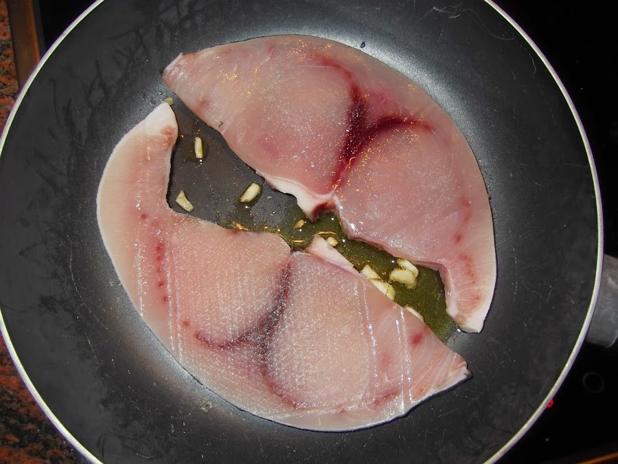 Ahora toca ponernos con el pescado, en una sartén diferente, echamos un chorro de aceite con el ajo restante, salamos los filetes y cuando el ajo haya cogido un poco de color los añadimos, les damos varias vueltas para que se hagan por los dos lados, como soltarán algo de agua ponerlos a fuego fuerte y estarán listos cuando adquieran un tono dorado, ese es el momento de añadirles el limón y sacarlos de la sartén.