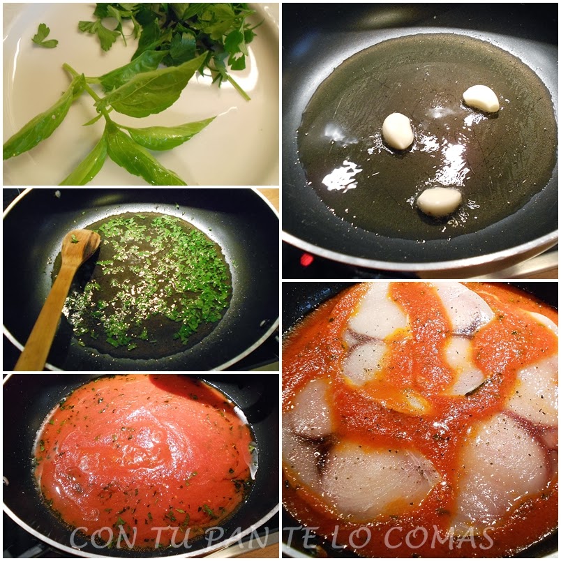 En el mismo aceite sofreímos el perejil picado y la albahaca también picada durante un minuto y enseguida echamos el tomate, sal y azúcar (yo le pongo casi la misma cantidad), y dejamos que se haga a fuego lento durante 15-20 minutos. Tapamos la cazuela porque ya sabemos que el tomate salpica un montón.