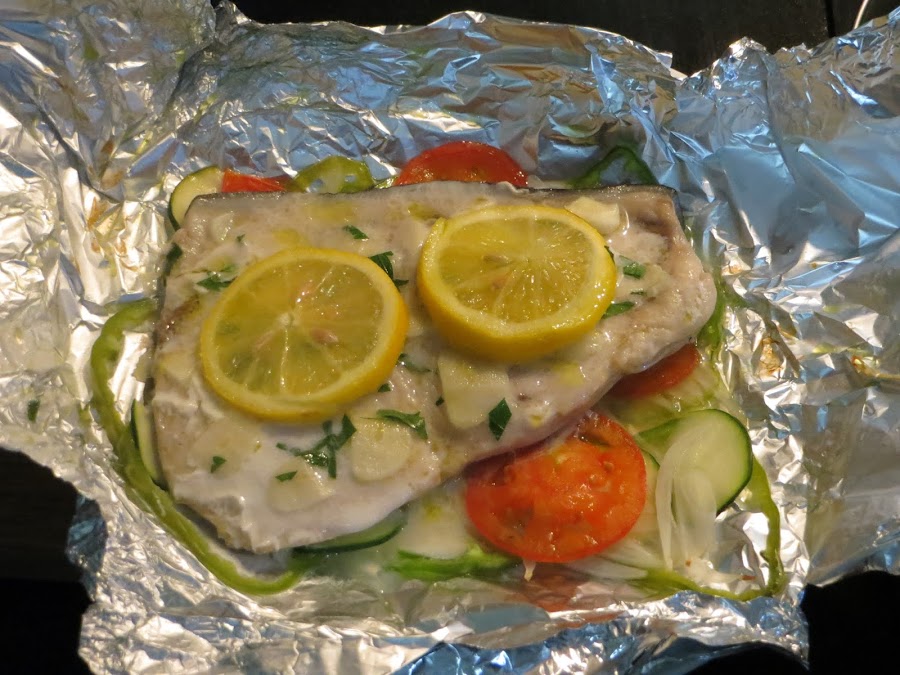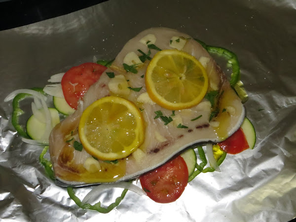 Colocamos el pescado encima, salpimentamos y le ponemos un par de rodajas de limón, ajo y perejil. Cerramos con el papel albal haciendo un paquete y metemos al horno a 180ºC durante 30 minutos. Sacamos y ya está listo para comer.