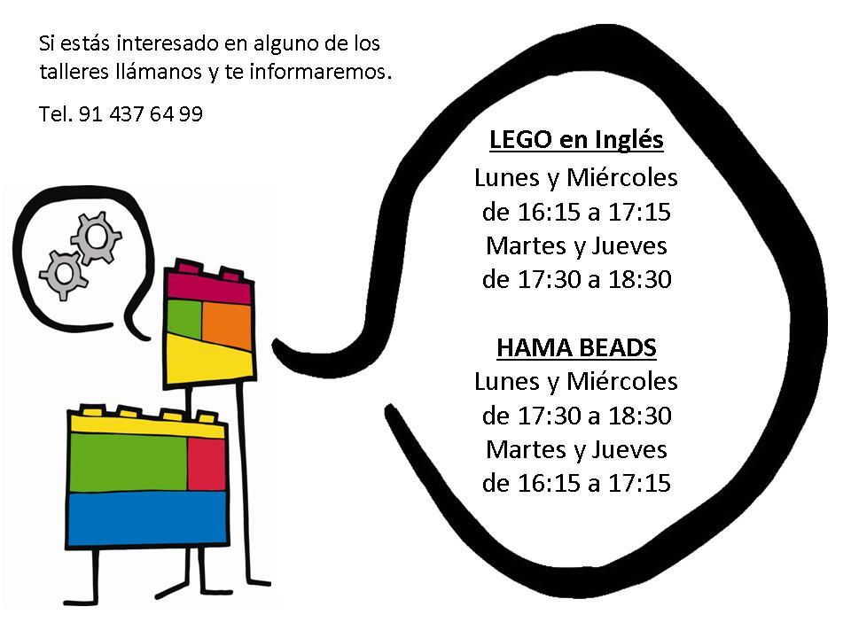 Hace unas semanas una amiga me habló de un nuevo local multi-actividad para toda la familia, en el que además de jugar, probar y comprar los juguetes LEGO, se organizan talleres (como los que aparecen anunciados en la imagen, Lego en Inglés y Hama Beads), fiestas infantiles temáticas, cumpleaños...