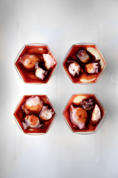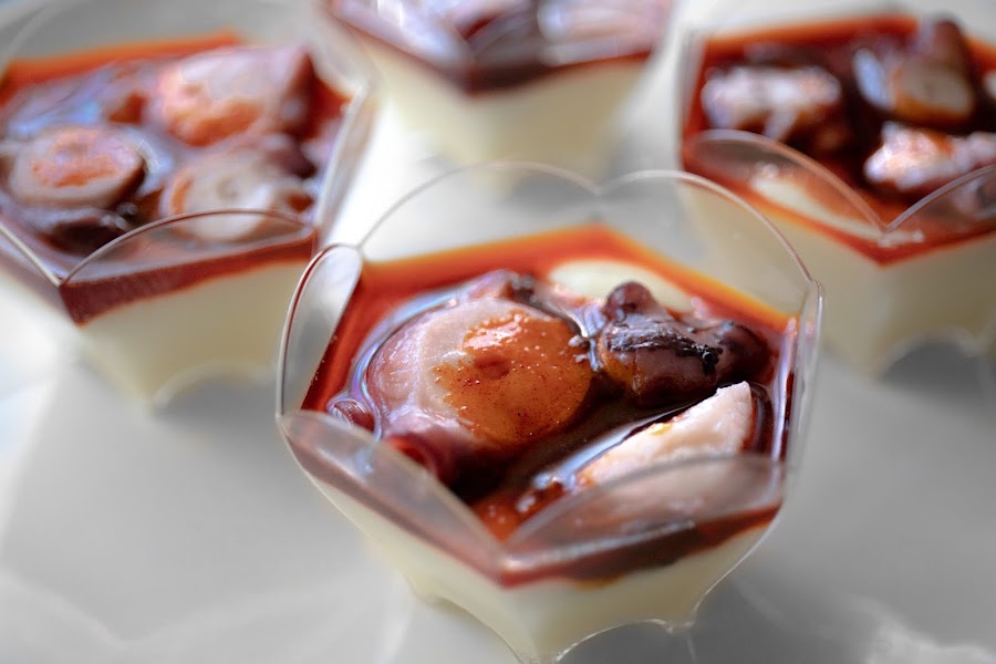 Lo serví en unos vasitos. En el fondo emulsión de patatas, luego unos trocitos de pulpo troceado, por encima un poco del aceite de pimentón y por ultimo unas escamas de sal Maldón.