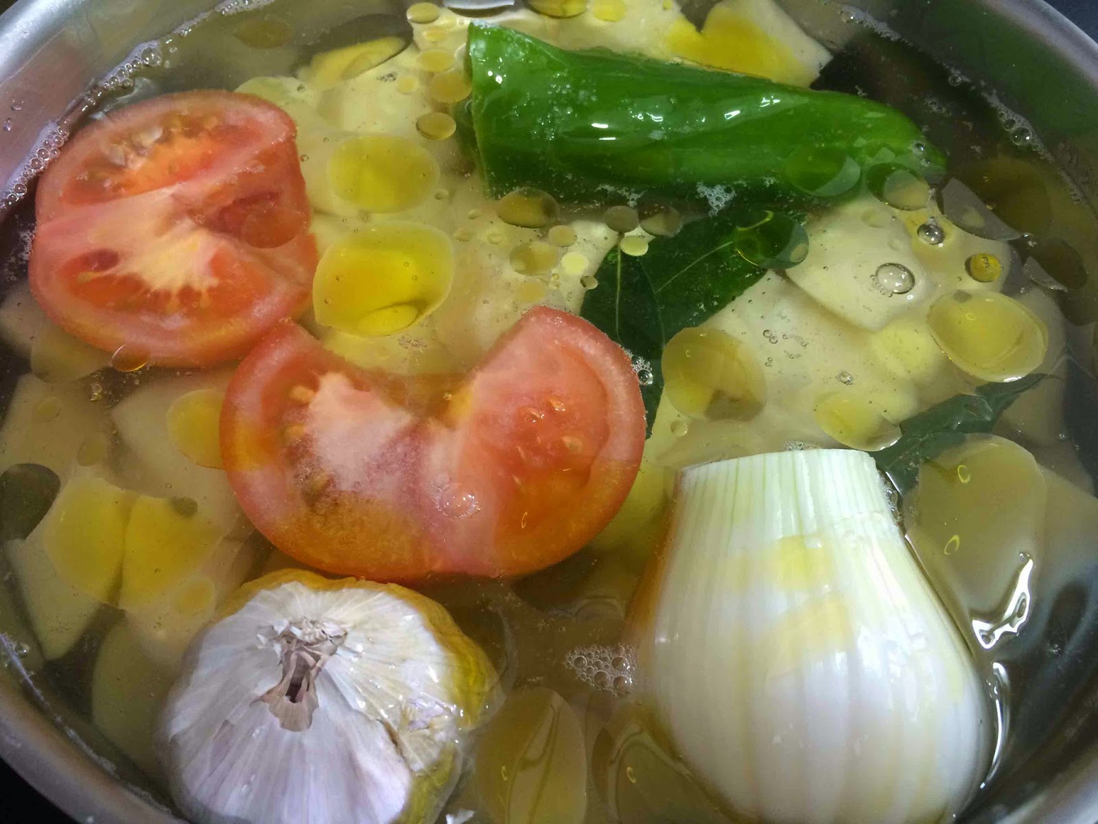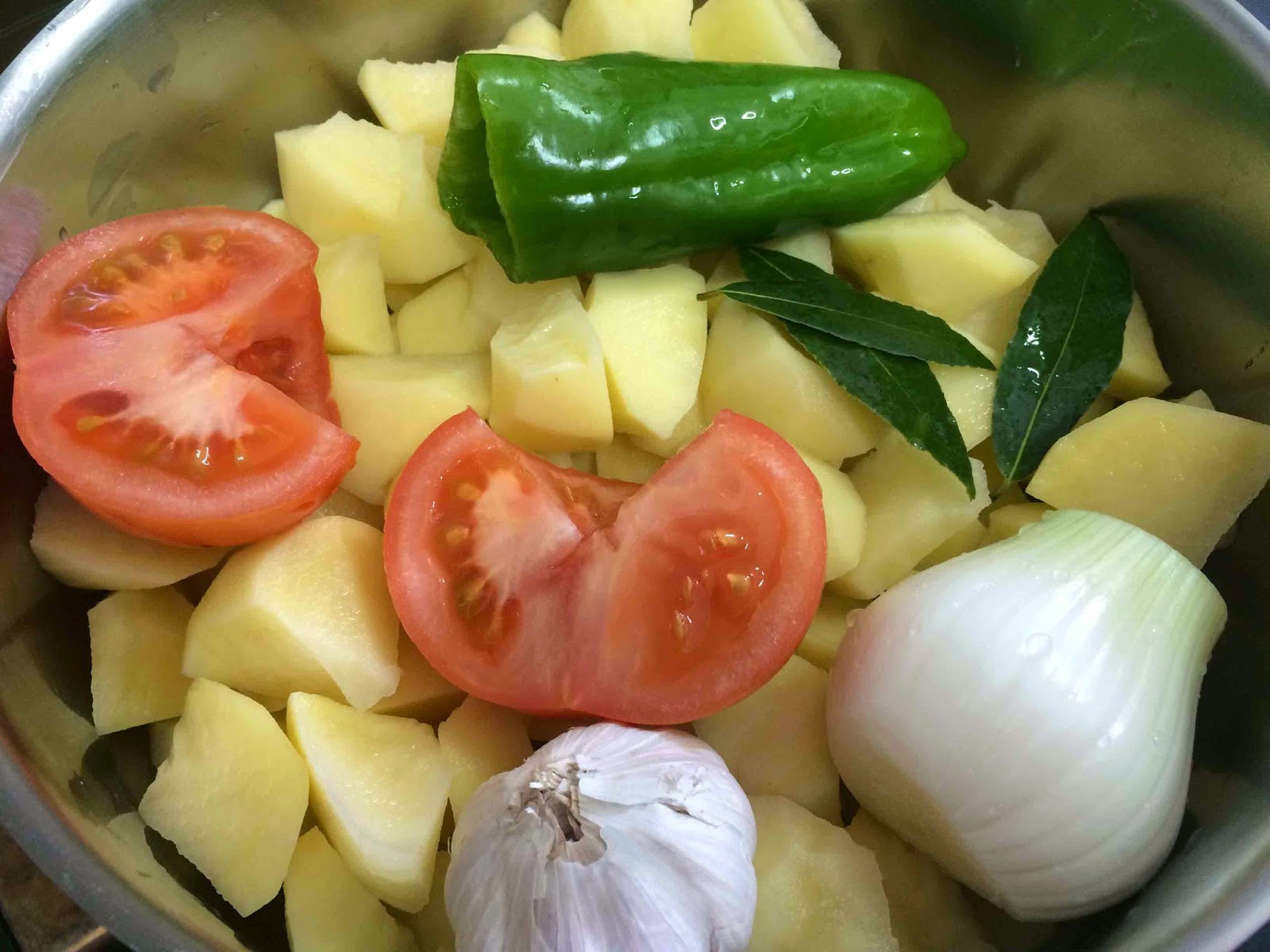 Pelamos y cascamos las patatas. Las colocamos en una cacerola junto con el pimiento limpio de semillas, el tomate partido por la mitad, la cebolleta, la cabeza de ajos y las hojas de laurel.