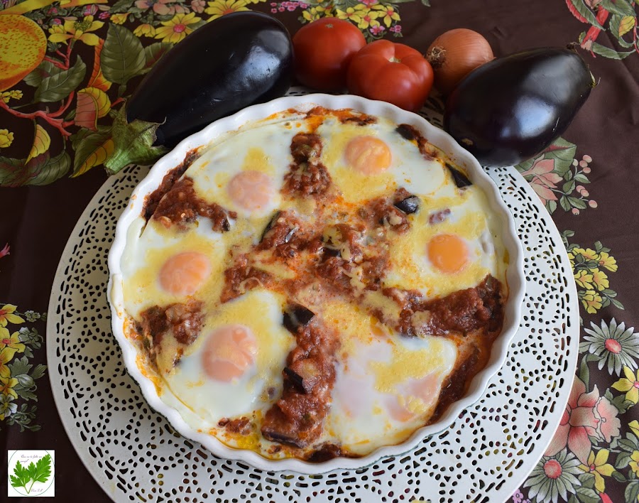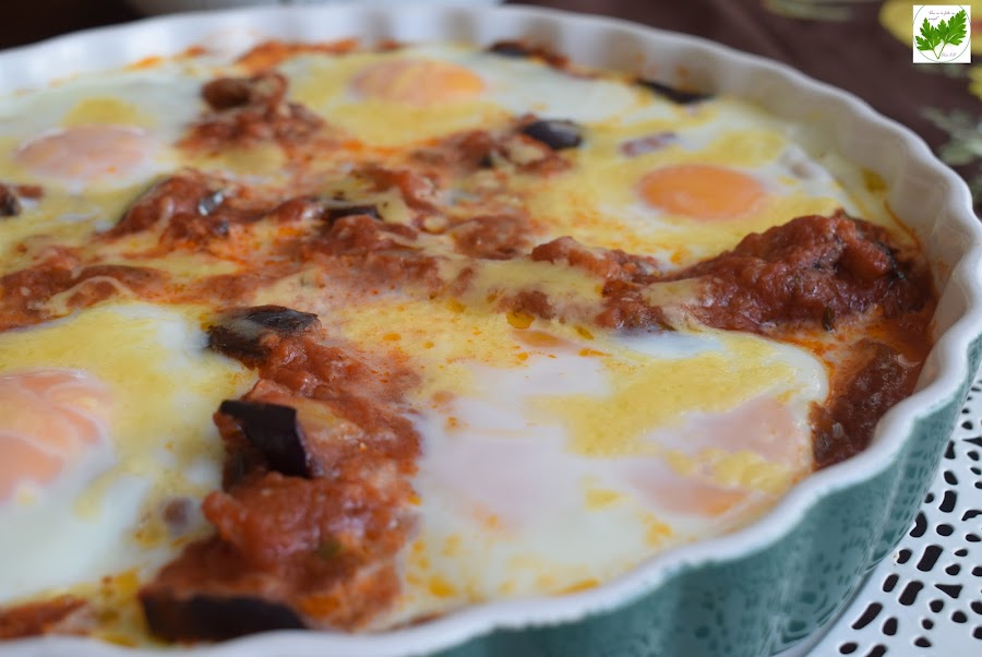 Cubre las patatas con las berenjenas. Haz unos hoyitos con una cuchara, casca un huevo en cada uno de ellos. Espolvorea queso rallado sore ellos. Introduce en el micronndas programando máxima potencia, 1 minuto, continúa minuto a minuto hasta que se cuajen los huevos o queden a tu gusto.