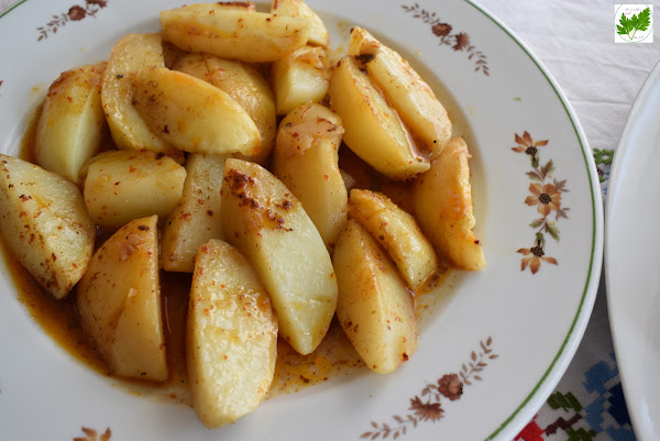 Pela las patatas y corta en gajos. Ponlas alrededor delosmuslos de pavo. Echa las patatas en el adobo, remueve vien para que queden bien impregnadas y ponlas en la fuente alrededor de los muslos de pavo. Pon la hoja de laurel. Tapa la fuente con papel transparente. Introduce en el microondas durante durante 15 minutos a máxima potencia. Espera 5 minutos antes de abrir la puerta. Saca las patatas a un plato de servir. Vuelve a tapar la fuente con el pavo, programa 10 minutos, máxima potencia.