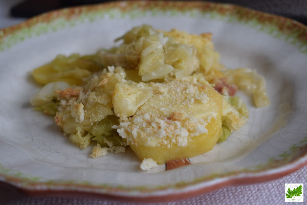 En una fuente de horno pon una capa de col, encima una tanda de patatas, otra de col y termina con patatas. Pon el queso y el pan rallado. Mete en el horno, con grill a 200º hasta que veas que el pan está dorado y crujiente.