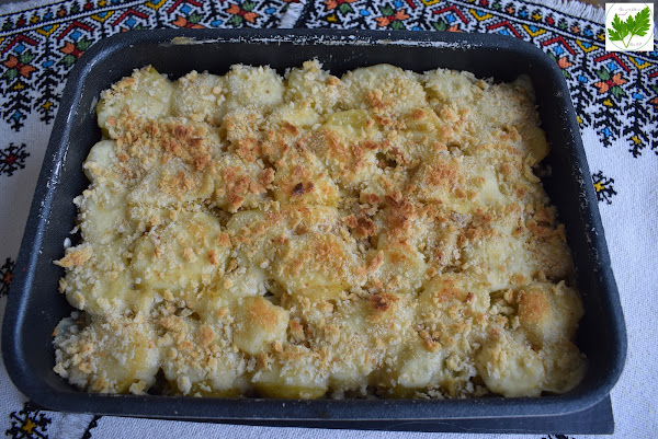 Sin complicarnos más la vida, quiero compartir una receta fácil, sana, económica y sencilla. Vuelvo a utilizar el microondas; esta vez, pastel de col rizada y patatas, gratinado con queso y costra de pan que aportará el toque crujiente al plato.