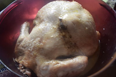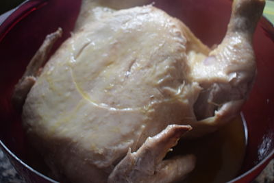 Da la vuelta al pollo, vuelve a tapar e introduce de nuevo en el horno durante otros 20 minutos a máxima potencia.