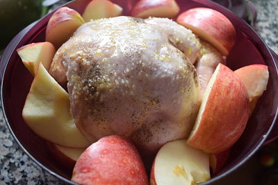 Salpimenta el pollo. Parte un limón por la mitad, una de ellas la pones dentro del pollo junto con un trozo de manzana. Introduce el pollo en un recipiente apto para microondas que tenga tapadera. Yo tengo éste de la marca táper, pero sirve también uno tipo Pirex con su tapadera. Añade por encima un buen chorro de AOVE, perejil picado, laurel y las manzanas cortadas en cuartos.