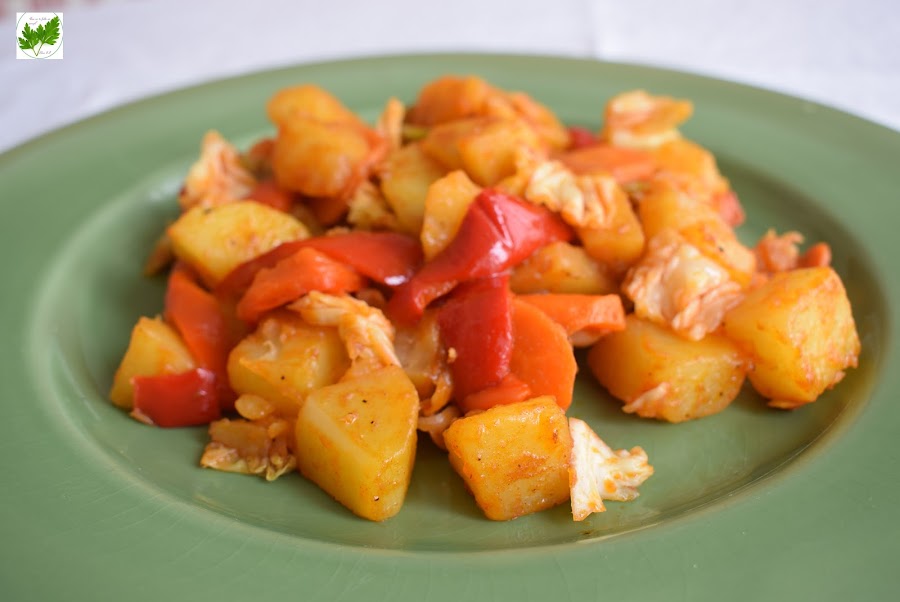 Pela y lava las patatas. Corta en dados. Introduce en el microondas durante 10 minutos, máxima potencia. Añade al resto de ingredientes que tenemos reservados.