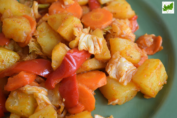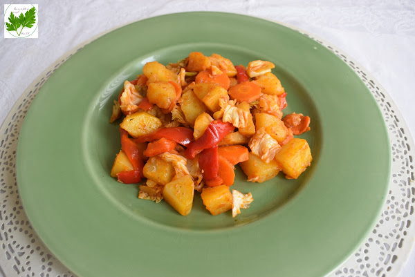 En un recipiente grande, apto para microondas, pon los dientes de ajos laminados. Añade 2 cucharadas de aceite. Introduce en el microondas durante 3 minutos. Saca, añade el pimentón, remueve con una cuchara, introduce de nuevo durante 1 minuto y 30 segundos, máxima potencia. Agrega todos los ingredientes reservados, pon sal, pimienta y remueve con cuidado para que se impregnen bien en el aceite con el pimentón. Mete de nuevo durante 2 o 3 minutos más.