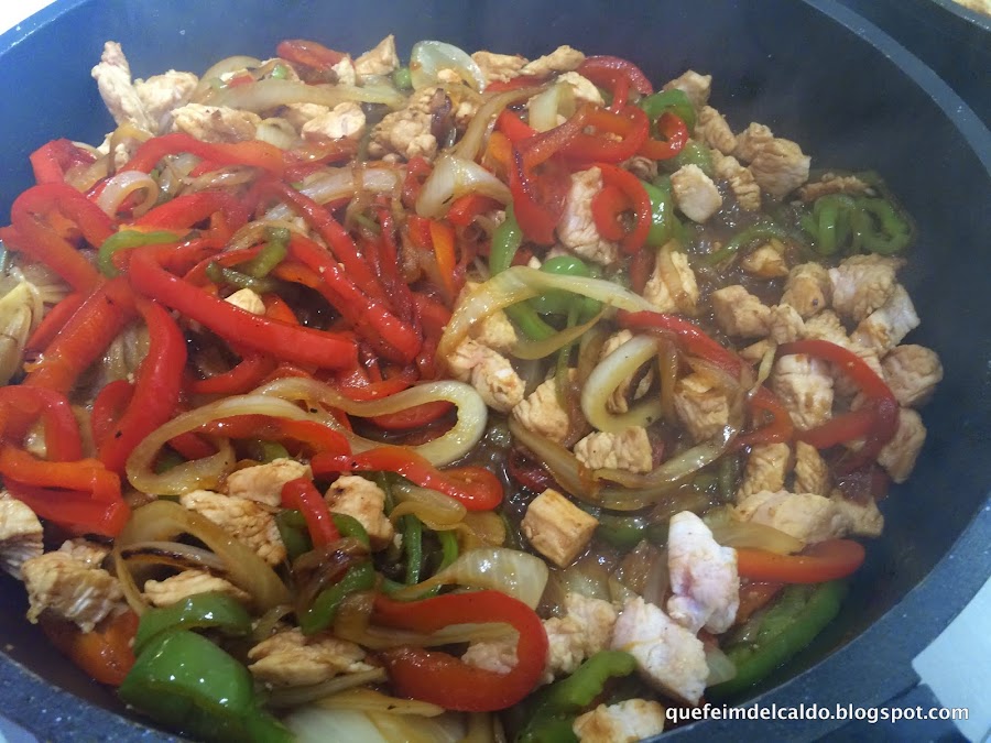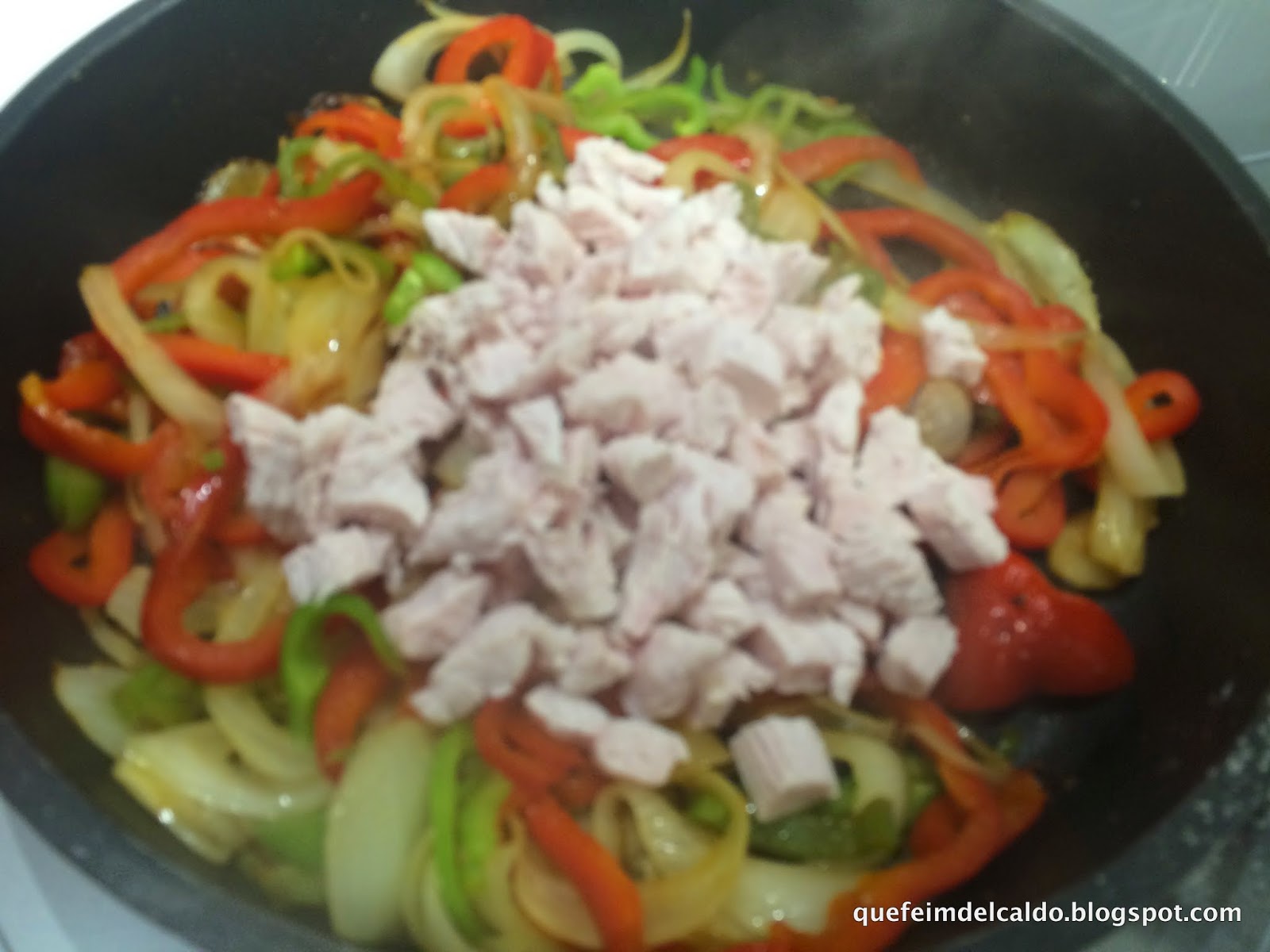 Mientras tanto cortamos el pollo a trozos pequeños y lo añadimos a la sartén, le damos una vuelta para mezclar todos los ingredientes.